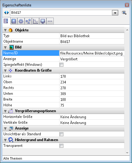 Das funktioniert auch für Bilder der Bildbibliothek; für Bilder, die anderen Objekten zugeordnet sind, z.B. eine 3D Bildschaltfläche; und für Felder oder Variablen im Anwendungsmodus.