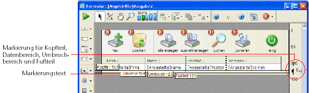 Sie steuern den Kopfteilbereich, den Daten- und Umbruchbereich und den Fußteilbereich über die Steuerlinien für die Ausgabe im Formulareditor. Ziehen Sie diese Steuerlinien nach oben oder unten, um einen Bereich zu vergrößern oder zu verkleinern. Jedes Objekt, das Sie in einen dieser Bereiche setzen, wird an der entsprechenden Stelle angezeigt oder gedruckt.