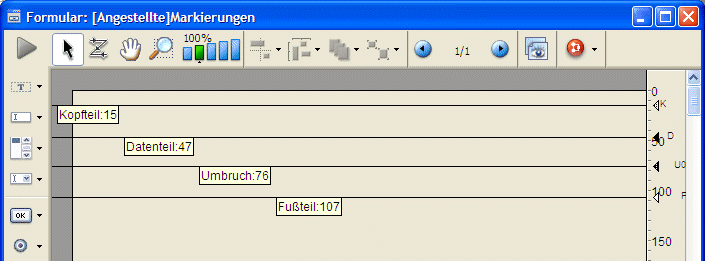 Warnung: Aktive Objekte (Datenfelder oder Variablen), die im Datenteil von Formularen liegen, dürfen nicht in Kopf- bzw. Fußteil hineinragen, denn dann werden sie beim Ausführen des Formulars nicht angezeigt.