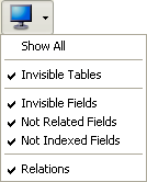 - 複数のフィールドタイプがチェックされていると、論理OR演算を使用して表示するオブジェクトが決定されます。例えば非表示フィールドとインデックスされていないフィールドオプションが選択されている場合、(表示・非表示属性に関わらず) すべてのインデックスがないフィールドと、(インデックス属性に関わらず) すべての非表示フィールドが表示されます。