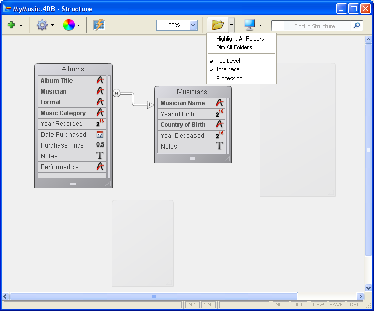 エクスプローラーウィンドウのホームページページで定義されたフォルダーに基づき、ストラクチャーエディター内でテーブルグループを非表示にすることができます。ストラクチャーエディターのツールバーにあるフォルダーボタン