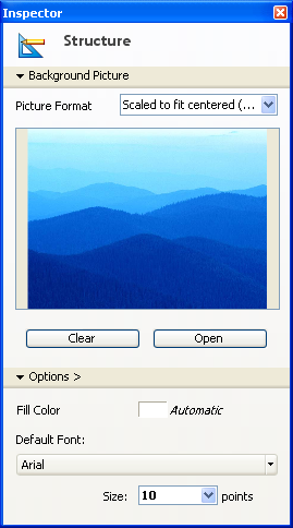 カスタムピクチャーを削除するには、クリアボタンをクリックするか、プレビューエリアをクリックしてコンテキストメニューからクリアを選択します。 - 塗りカラー: エディターウィンドウのバックグランドに使用されるカラーを変更できます。これを行うにはカラー選択エリアをクリックして選択メニューからカラーを選択します。