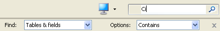検索は値を入力するに従いリアルタイムで実行されます。検索されたテーブルやフィールドは強調表示されます。何も見つからないと、検索条件エリアが赤に変わります。検索モードを抜けるには、オプションバー (Windows) または検索条件エリア (Mac OS) の