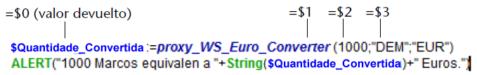 Para chamar um sistema proxy no seu código, simplesmente escreva seu nome e passe os parâmetros requeridos. Estes parâmetros são declarados na área de cabeçalho do sistema proxy pelo Assistente de Serviços Web. Conforme a sintaxe padrão para passar parâmetros entre sistemas em 4D, são chamados $0, $1, $2... Podem ser visualizados nos parâmetros avançados da descrição do sistema publicado (ver Uso de parâmetros avançados) e às vezes são descritas em sua documentação.