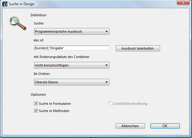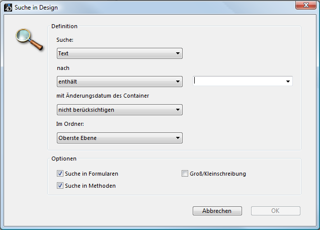 • Suche in Formularen: Ist diese Option nicht markiert, läuft die Suche in der Datenbank mit Ausnahme von Formularen und Formularnamen.