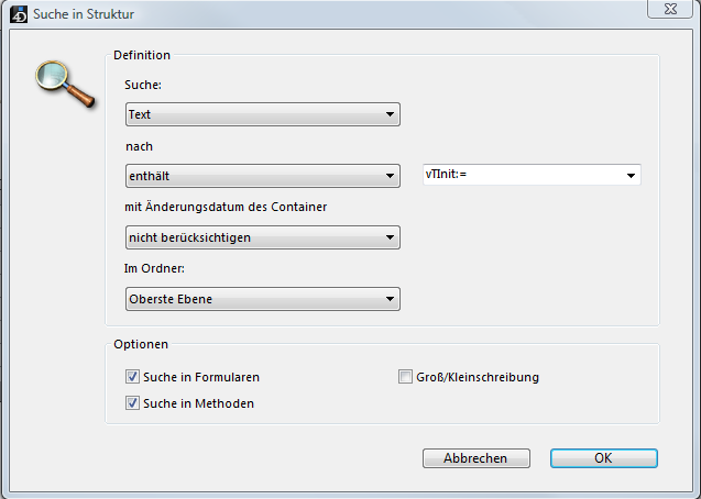 • enthält ganzes Wort: Sucht in allen Texten der Designumgebung nach dem String als ganzes Wort. Die Suche nach "var" findet nur, was exakt zutrifft. Sie findet z.B. nicht "meinevar", jedoch "var:=10" oder "ID+var", da die Symbole : oder + Worttrenner sind.
