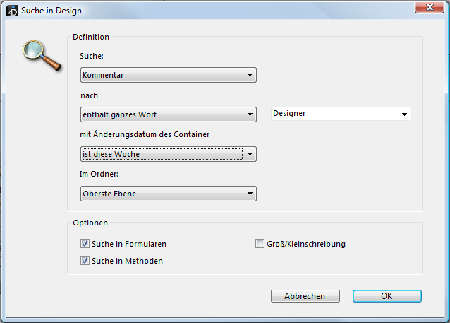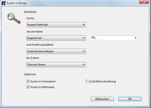 • Suche in Methoden: Ist diese Option nicht markiert, läuft die Suche in der Datenbank mit Ausnahme von Methoden und Methodennamen.