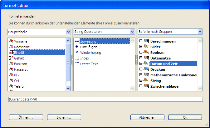 Verwenden Sie den Formeleditor, um Datensätze über eine Berechnung oder Datenbearbeitung zu finden. Im Formeleditor geben Sie einen Ausdruck ein, der die Suche ausführt. Ihre Formel muss als Suchergebnis für jeden Datensatz WAHR oder FALSCH ergeben. Sie können jede Funktion der Programmiersprache sowie vom Entwickler speziell dafür vorgesehene Projektmethoden verwenden.