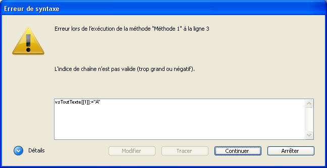 Lorsque vous utilisez les symboles d'indice de chaîne, il est de votre responsabilité de vous référer à des caractères existant dans la chaîne, de la même manière que pour les éléments d'un tableau. Si, par exemple, vous référencez le 20e caractère d'une chaîne, cette chaîne doit contenir au moins 20 caractères.