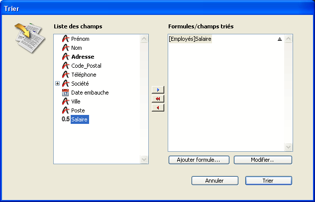 TRIER([Produits];[Produits]Type;>;[Produits]Prix;>)L'exemple suivant trie la sélection courante de [Produits] par type et par prix dans un ordre décroissant à chaque niveau :