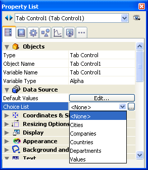 - タブコントロールをデフォルト値のリストに関連付けることができます。このリストには、プロパティリストの"データソース"テーマの"デフォルト値"プロパティの横にある"編集..."ボタンからアクセスできます。この件に関する詳細はデフォルト値のリストを参照してください。デフォルト値は自動でテキスト配列にロードされます。タブコントロールに関連付けた変数名を用いてこの配列を参照することができます。