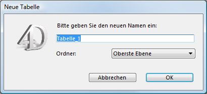 Der Tabellenname kann bis zu 31 Zeichen lang sein und muss mit einem Buchstaben beginnen. Er kann Buchstaben, Ziffern, Leerzeichen und Unterstriche enthalten. 4D schneidet längere Namen ab und entfernt Leerzeichen zu Beginn und am Ende des Namens. - (optional) Wählen Sie den Ordner, in welchen die neue Tabelle gelegt werden soll.