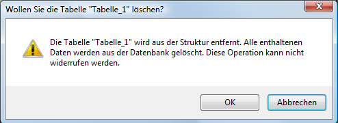 - Die Tabelle wird unwiderruflich aus der Struktur entfernt. Alle damit verknüpften Daten werden unwiderruflich aus der Datendatei gelöscht.