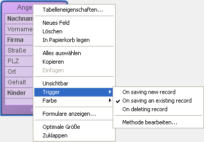 Trigger-Ereignisse können Sie im Inspektorfenster oder über das Kontextmenü der Tabelle einrichten (rechter Mausklick in den Tabellentitel):