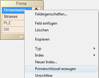 Klicken Sie mit der rechten Maustaste und wählen im Kontextmenü den Eintrag Primärschlüssel erzeugen: