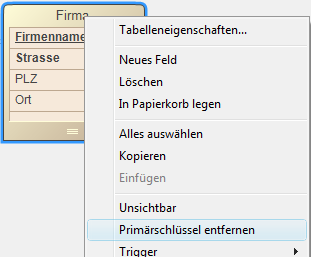 Klicken Sie mit der rechten Maustaste auf die Tabelle mit dem Primärschlüssel und wählen im Kontextmenü den Eintrag Primärschlüssel entfernen: