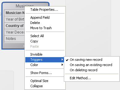 You can access the trigger of a table directly from the Structure editor by clicking on the Edit... button in the Inspector palette or by selecting Edit Method... in the context submenu. For more information about triggers, refer to Types of Methods.
