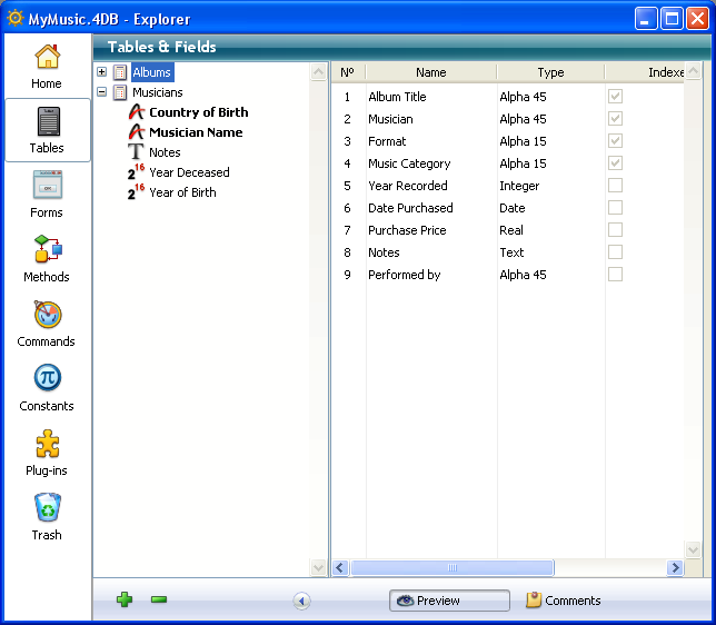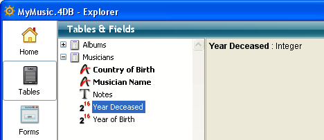 The Tables page lists all the tables and fields in the database. It can be used as an alternative to the Structure editor to access table and field properties. When a table is expanded, the fields in the table are shown.