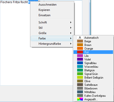Die Option Kontextmenü aktiviert für den Benutzer die Möglichkeit, während der Dateneingabe durch rechten Mausklick in den Bereich ein PopUp-Menü aufzurufen. Dieses Menü enthält die Standardbefehle zur Textbearbeitung (Ausschneiden, Kopieren, Einsetzen), sowie Befehle für die unterstützten Stilveränderungen: Schrifttyp, -größe, -stil, -farbe, sowie für Windows Hintergrundfarbe:
