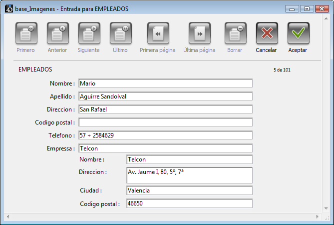Cuando un registro de la tabla [EMPLEADOS] se convierte en el registro actual, 4D carga el registro correspondiente de la tabla [EMPRESAS]. Si algunos campos han sido incluidos desde la tabla [EMPRESAS], los valores de estos campos se muestran automáticamente.