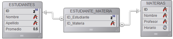 La siguiente imagen muestra la base de datos de inscripciones con tres tablas, [ESTUDIANTES], [MATERIAS] y [ESTUDIANTE_MATERIA]. Esta sección utiliza la estructura de esta base de datos para explicar cómo funcionan las relaciones Muchos a Muchos.