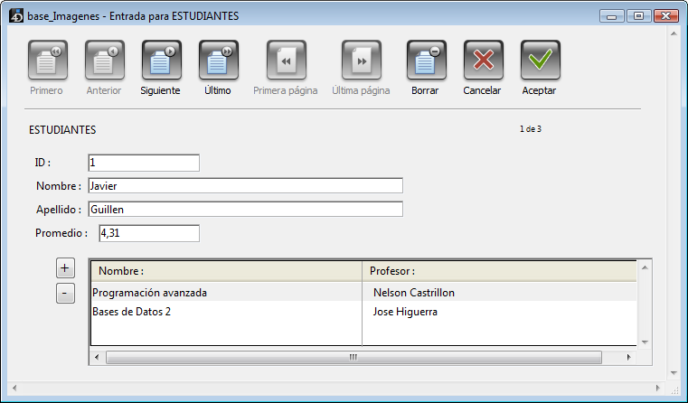 El registro de la imagen anterior está en la tabla [ESTUDIANTES]. Se muestra la información del estudiante en la parte superior y el subformulario en la parte inferior muestra la información de las materias que ha inscrito, traída de la tabla [ESTUDIANTE_MATERIA].