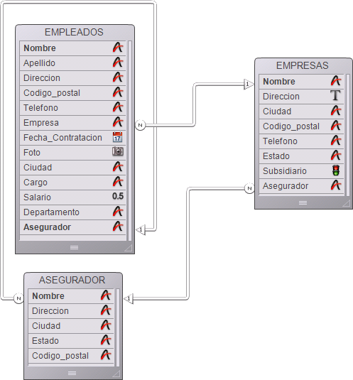 Una relación circular es un conjunto de relaciones definidas de manera que la transferencia de datos forma un bucle indefinido. La siguiente imagen le muestra una relación circular en la que la tabla [EMPLEADADOS] está relacionada a la tabla [EMPRESAS], que a su vez está relacionada a la tabla [ASEGURADOR], que vuelve a relacionarse a la tabla [EMPLEADOS].