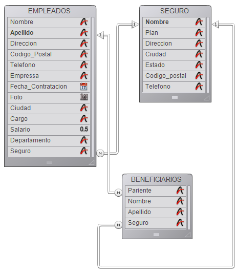 Cuando un usuario está trabajando con un registro de la tabla [EMPLEADOS], el registro relacionado de la tabla [SEGURO] se carga y se convierte en el registro actual para esa tabla.