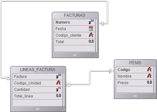 Cuando un registro de la tabla [FACTURAS] es utilizado, se crea una selección de registros en la tabla [LINEAS_FACTURA] que contiene todas las líneas para esta factura. Sólo se carga el registro de la tabla [ITEMS] correspondiente al primer registro de la tabla [LINEAS_FACTURA]. La selección actual de la tabla [ITEMS] no contiene información sobre todos los objetos de la factura, sólo sobre el primer objeto de la factura.