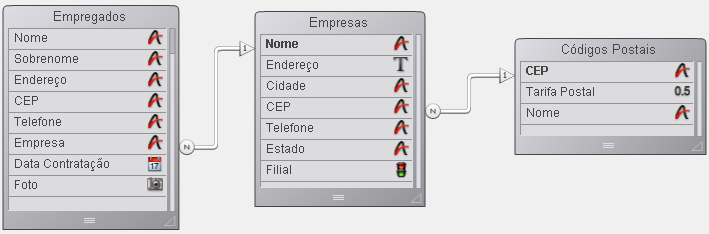 Uma tabela é uma tabela Um ou Muitos dependendo da relação com a outra tabela. A tabela [EMPRESAS] é a tabela Muitos na relação com a tabela [CODIGOS_POSTAIS] e é a tabela Um na relação com a tabela [EMPREGADOS].