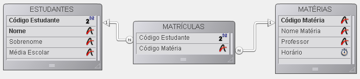 É utilizada uma tabela intermediária, neste exemplo a tabela [MATRICULAS], para introduzir e mostrar informação das outras duas tabelas. Cada registro introduzido na tabela [ESTUDANTE_MATERIA] está relacionado com as outras tabelas (ESTUDANTES e MATERIAS). Os registros da tabela [MATRICULAS] só contém as duas partes de informação que estabelece a relação: a identificação do estudante e o nome da matéria.