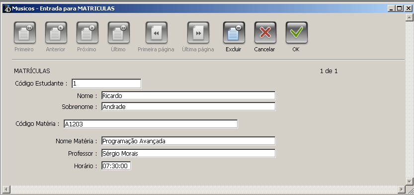 Este é um exemplo de um registro que está sendo introduzido na tabela [MATRICULAS]: