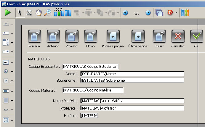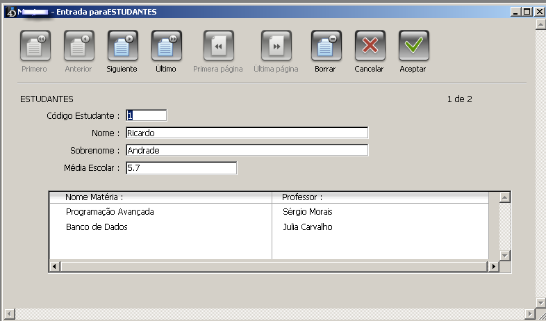 O registro da imagem anterior está na tabela [ESTUDANTES]. É exibida a informação do estudante na parte superior, e o sub-formulário na parte inferior mostra a informação das matérias inscritas, trazida da tabela [MATRICULAS].