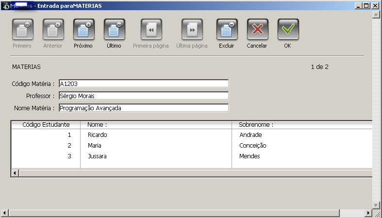 Este é um registro da tabela [MATERIAS]. Exibe informação da matéria e a lista de estudantes inscritos. A informação dos estudantes também é trazida da tabela [MATRICULAS], que contém os registros que relacionam as classes com os estudantes inscritos nelas.
