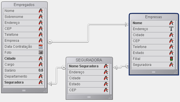 Quando 4D encontra este tipo de relações circulares, as relações entre as tabelas são detidas na última tabela na última tabela na cadeia. Neste caso, a relação entre as tabelas [SEGURADORA] e [EMPREGADOS] não é realizada.