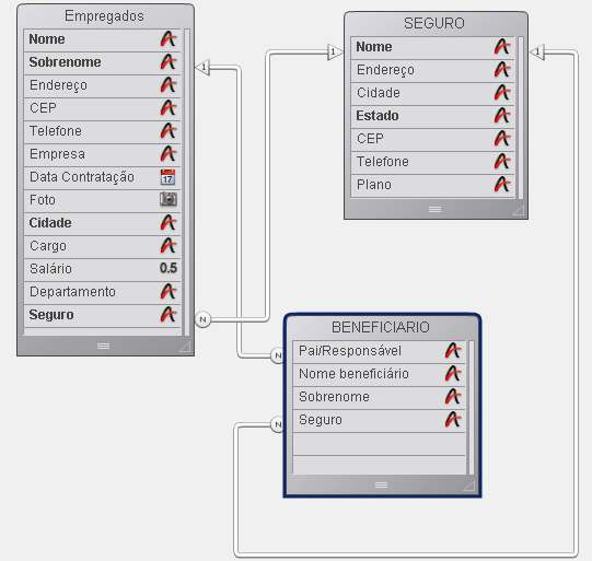 Quando um usuário está trabalhando com um registro da tabela [EMPREGADOS], o registro relacionado da tabela [SEGURO] é carregado e se converte no registro atual para esta tabela.
