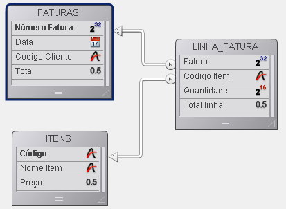 Quando um registro da tabela [FATURAS] é utilizado, é criada uma seleção de registros na tabela [LINHA_FATURA] que contém todas as linhas para esta fatura. Só é carregado o registro da tabela [ITENS] correspondente ao primeiro registro da tabela [LINHA_FATURA]. A seleção atual da tabela [ITENS] não contém informação sobre todos os objetos da fatura, só sobre o primeiro objeto da fatura.