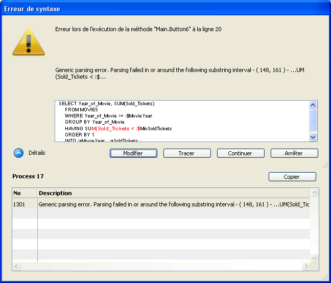 Voici un exemple de code dans lequel une parenthèse droite est manquante : la ligne HAVING SUM(Sold_Tickets < :$MinSoldTickets devrait se terminer par une parenthèse.