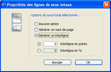 Sélectionnez une ligne de sous-total et choisissez la commande Espacement des totaux dans le menu Fichier de l’éditeur. OU Cliquez avec le bouton droit sur le libellé du sous-total et choisissez la commande Espacement des totaux. La boîte de dialogue “Propriétés des lignes de sous-totaux” apparaît :