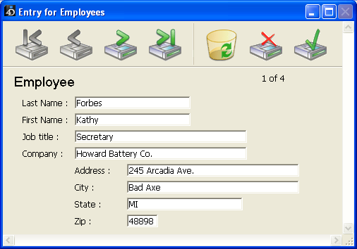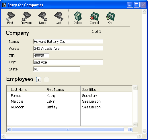 When any record in the [Employees] table is made current, 4D loads the corresponding single record from the [Companies] table. If any fields have been included from the [Companies] table, the values for these fields are automatically displayed.