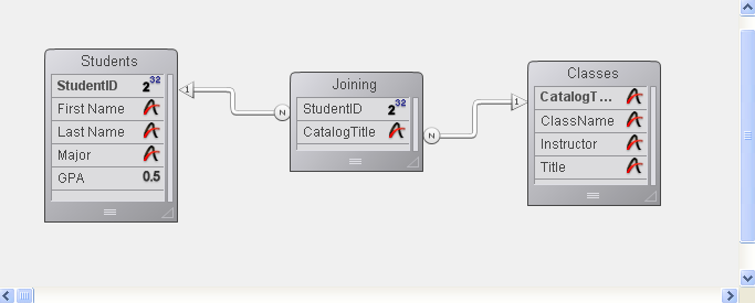 The figure below shows the enrollment database with three tables, [Students], [Classes], and [Joining]. This database structure is used throughout this section to explain how an automatic Many to Many relation works.