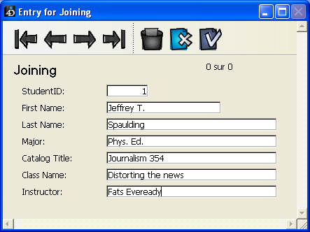 You use the intermediate table —þin this example the [Joining] table — to enter and display information from both of the other tables. Each record that you enter in the [Joining] table is related to both of the other tables (a student and a class). The records from the [Joining] table contain only the two pieces of information that establish the relation: the student ID and the catalog title. Here is an example of a new record being entered in the [Joining] table.