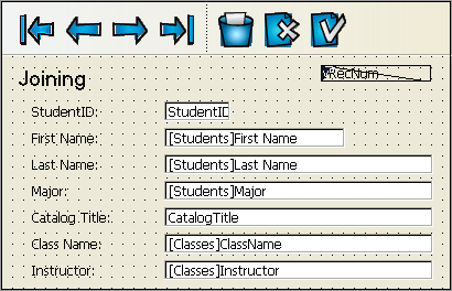 The record shown above is in the [Students] table. It shows information about the student at the top of the record. The information about the two classes that he is enrolled in is drawn from the [Joining] table where the enrollment information is kept.