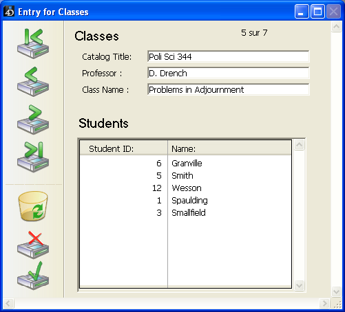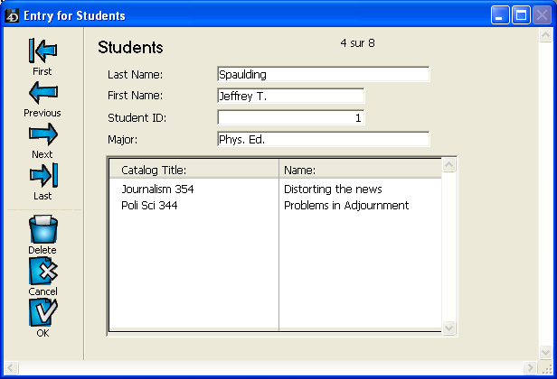 In the above examples of subforms, you can enter records in any of the fields shown. For example, to enter a new student into a class record, you simply tab to the last student record shown in the subform and press Ctrl+Shift+/ (Windows) or Command+Shift+/ (Mac OS) to create a new record (you can change this shortcut in the Database Settings, see ). When you enter the appropriate catalog title, the remainder of the information is entered in the record.