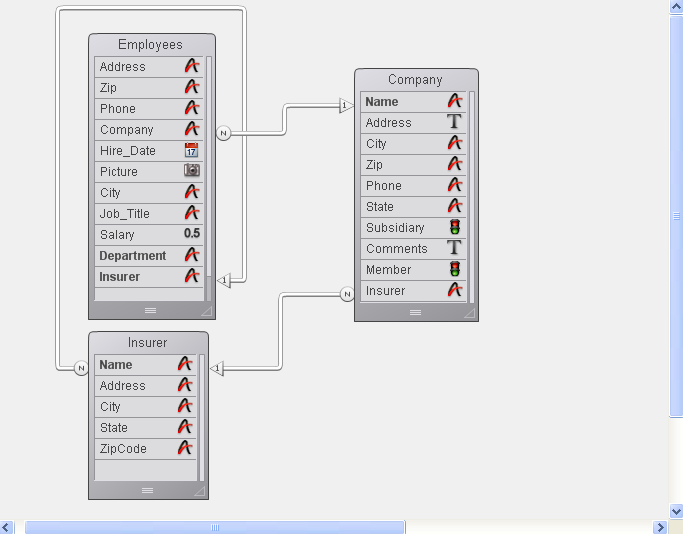 When 4D encounters this kind of circular relation, table relations are stopped at the last table in the chain. In this case, the relation between the [Insurer] table and the [Employee] table is not carried out.