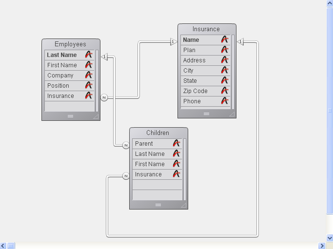 A circular relation is one in which table relations are set up so that the transfer of information will loop indefinitely. The figure below shows a circular relation in which the [Employees] table relates to the [Company] table, which relates to the [Insurer] table, which relates back to the [Employee] table.