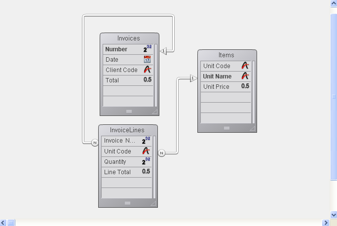 Since there is only one current record in a table, relations are not established for all of the records in a selection. Let’s take the case of the the Invoices database shown in the structure below: