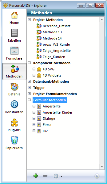 Über die Schaltflächen am linken Rand gelangen Sie auf die einzelnen Seiten im Designmodus, das sind Tabellen, Formulare, Methoden, Befehle und Konstanten der 4D Programmiersprache und Plug-Ins.