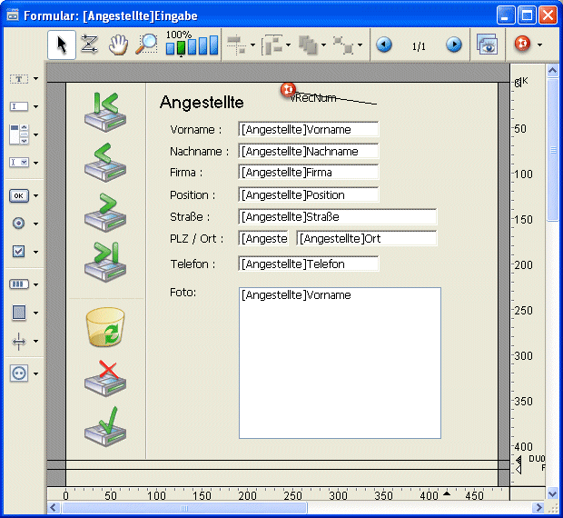 Der Formulareditor ist eine objektorientierte Zeichenumgebung, in der Sie Formulare durch direktes Bearbeiten der Objekte im Formular anpassen können. Zum Beispiel können Sie Objekte verschieben oder neue hinzufügen, die der Formularassistenz nicht unterstützt, mehrseitige Formulare mit Registerkarten erzeugen, Arbeitsregeln durch Beschränkungen bei der Dateneingabe vorgeben, Zugriffsrechte auf Formulare bestimmen, eine eigene Menüleiste mit einem Formular verknüpfen und Formular- und Objektmethoden schreiben, die automatisch abgearbeitet werden, wenn das Formular benutzt wird. Weitere Informationen dazu finden Sie im Abschnitt Formular bearbeiten.