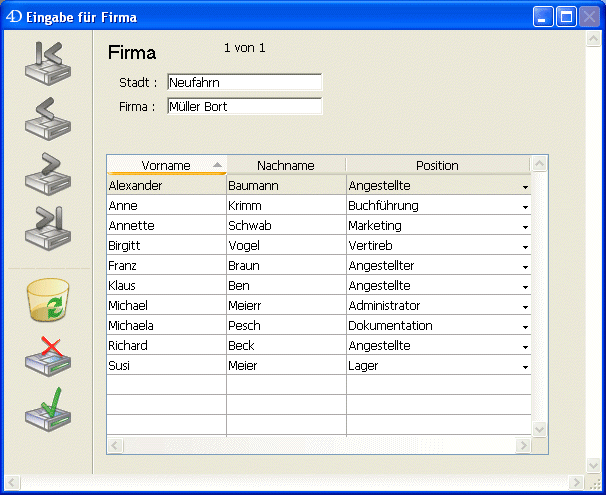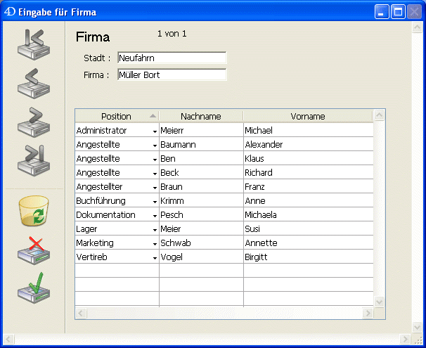 - Listbox vom Typ Auswahl: Die Anzahl der Zeilen richtet sich nach der aktuellen bzw. der temporären Auswahl. Jede Spalte wird einem Datenfeld, z.B. [Angestellte]Nachname) oder einem 4D Ausdruck zugewiesen. Der Ausdruck kann auf einem oder mehreren Datenfeldern, z.B. [Angestellte]Vorname+“ ”[Angestellte]Nachname) oder auf einer Formel, z.B. String(Milliseconds) basieren. Auch eine Projektmethode, eine Variable oder ein Array-Eintrag sind möglich.